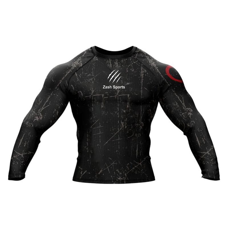 RogueSkin Blackout brings raw edge to elite performance wear. With distressed gray scratch patterns and a bold red shoulder accent, this long-sleeve compression shirt channels intensity and style.